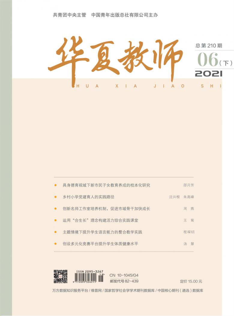 《华夏教师》创办于2012年,主要栏目有封面人物、热点聚集、三生动态、三生理论、三生感悟、管理纵横、校园巡礼、校长论坛、治校方略、华夏视点、教改前沿、课堂心得、交流与经验、教学相长、教育探索、学校发展与管理、课程与教学、学生发展指导、教育心理论坛、校园心理、问教天下,丰富的内容使您能够自由地遨游在知识的海洋里,了解最新趋势。致力于传播先进的教育理念,宣传优秀的教育人物和事迹,并提供一线教师的教学成果与心得分享平台,旨在提升基础教育工作者的专业素质和教学能力。