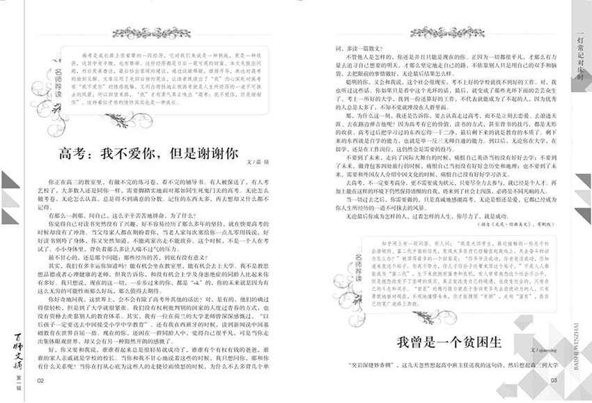 《百师文摘》是一本面向教师的业余读物,它向广大老师们推介最新的教育理念、教育方法和教育技巧,依托现代信息技术,打造了一个教师交流、学习和成长的平台。这本杂志主要针对的是中小学教师,它覆盖了学前教育、小学教育、初中教育和高中教育等各个阶段的教育,同时也包含了教育政策、教育研究、课程建设和教学效果等方面的报道,提供了一份全面的教育知识触角。从内容上来说,该杂志包含了很多有用的文章和信息。如“温故知新”,杂志的文章内容这方面涵盖了广泛的教育领域,包括课堂教学、教育咨询、新教育科技、专业发展、校园境内外、教育管理等。每个领域中都会有具体的案例分析、技巧分享和教育思考,同时提供一些必要的教育资源和趣味小品,涵盖读者所需的全部内容。