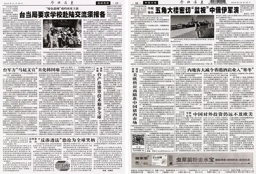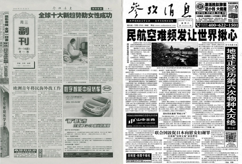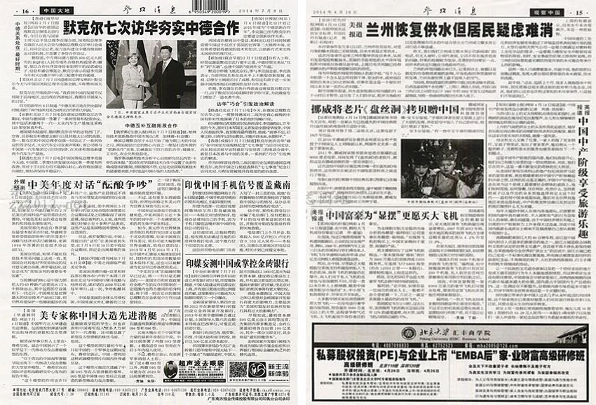 专题报道:该报选取国际热点和焦点事件进行深入的报道和研究分析,艰深复杂的领域都有所覆盖,例如国际科技、环境保护、卫生健康等多区域深度报道,表现在报纸细节上,是许多读者在选阅“参考消息”时的保障。