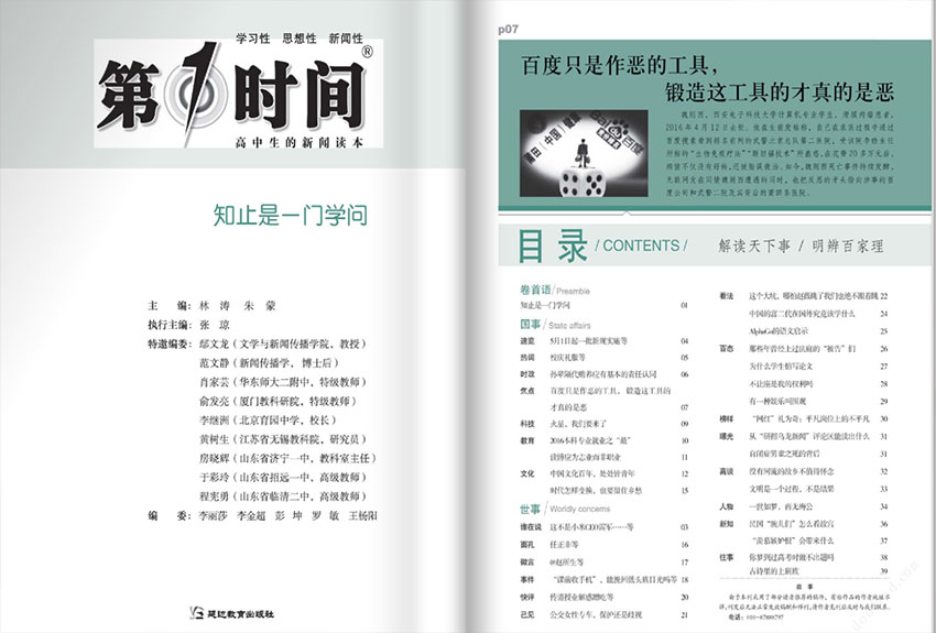 学习性:杂志内容紧密契合高中生的认知水平和求知需求,不仅是信息的传递,更是知识的拓展和学理的渗透。阅读杂志,本身就是一种有效的学习过程,能够补充课堂知识的不足,提升人文素养。思想性:杂志绝不满足于事实的罗列,而是特别注重“评论和引领”。针对重要事件和社会现象,邀请专家学者或资深教育工作者撰写深度评论,提供多元视角,激发学生思辨,引导他们从感性认知走向理性分析。新闻性:保证内容的时效性与新鲜度,“第一时间”提供高中生需要和感兴趣的各类新闻,确保学生与社会发展同步,不脱节于时代。