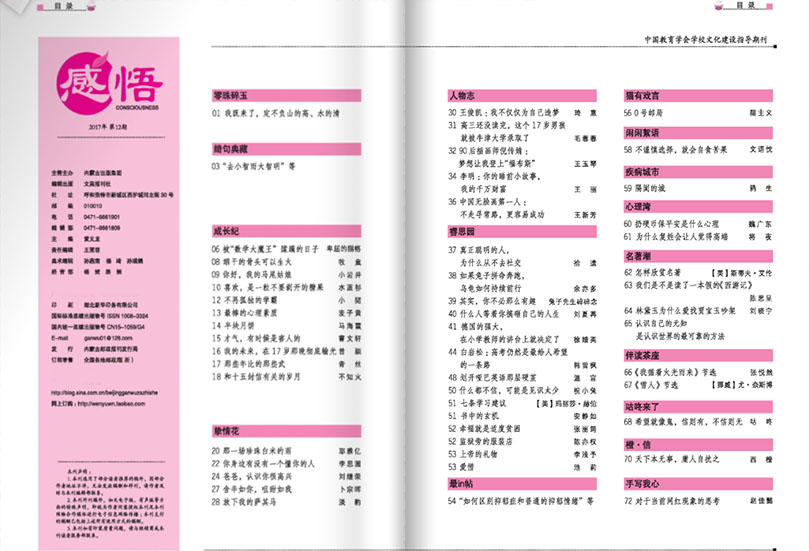 《感悟》主要栏目:心理港湾、人物绘本、南腔北调、人生锦囊、清心宝匣、读史探轶等。