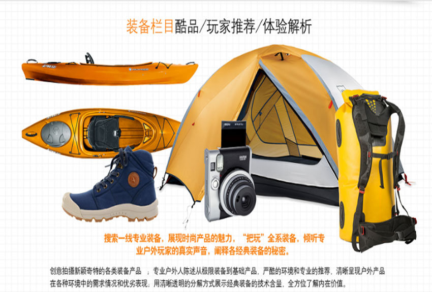《户外装备》主要栏目:头条、视觉、大玩家、玩家推荐、体验解析、发烧友、日记、目的地、装备栏目、酷品、训练营、特写、驾驭、寰宇地理、品牌装备。