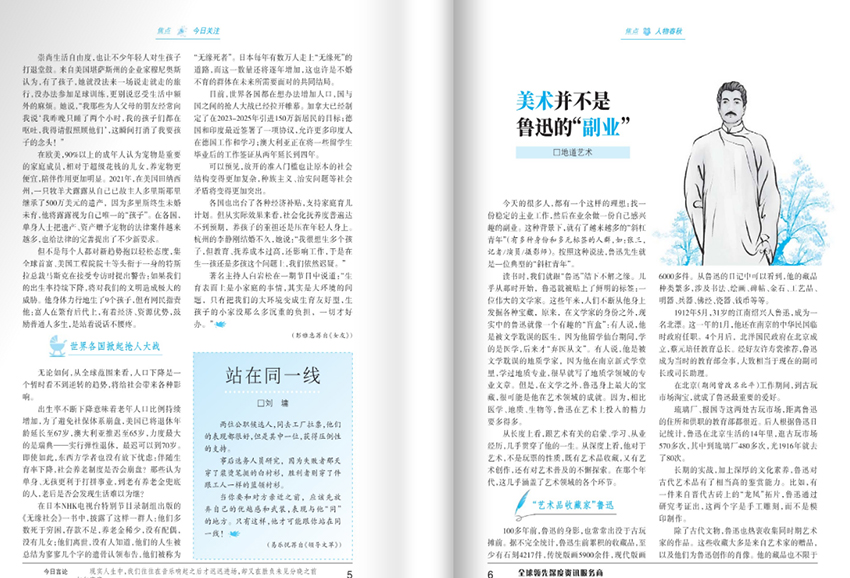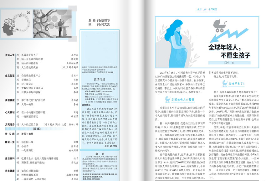 杂志以广阔的视野和精炼的选材,构建起覆盖人文、社会、文学、艺术、娱乐、生活、经济、科技、历史等多领域的知识体系。其栏目设置科学而丰富,既有“时事热点”“社会聚焦”等关注现实议题的深度栏目,也有“史海探秘”“历史揭秘”等回望过往的思辨专题;既有“文苑撷英”“文化博览”等展现审美情趣的文艺空间,也不乏“生活哲学”“情感专栏”等贴近日常的精神慰藉。