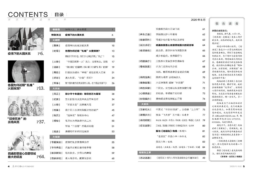 《新浪潮·老朋友》主要栏目:卷首语、大历史、特别关注、大视野、大健康、大家乐等。