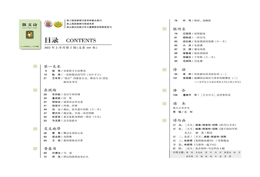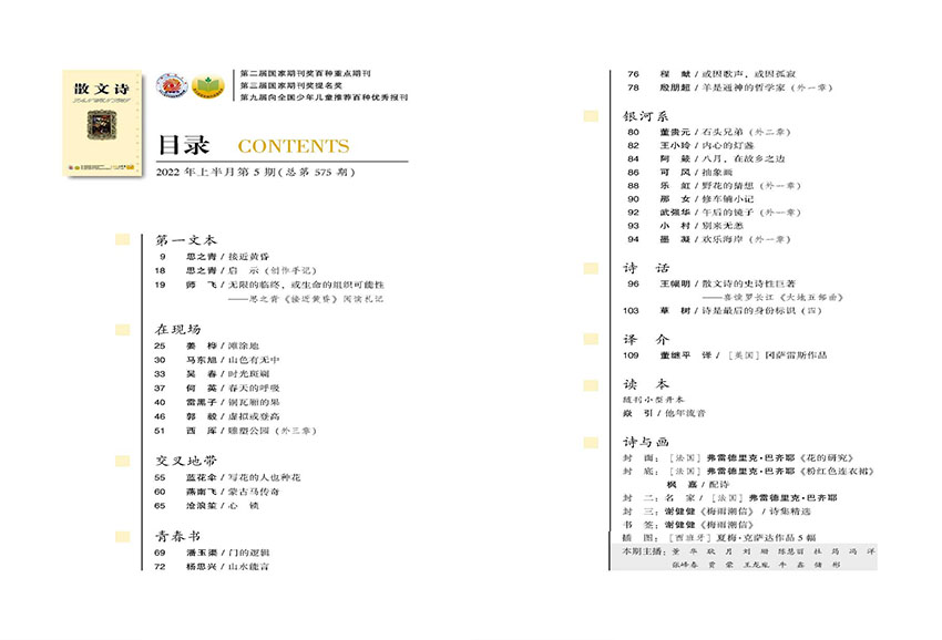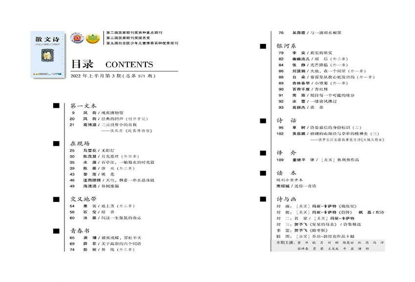 它打破了诗歌与散文的疆界,在限制中寻找自由,在自由中建立新的秩序。杂志敏锐地捕捉到了这一文体的独特魅力,并为其发展提供了丰沃的土壤。从"在现场"栏目的现实关怀,到"交叉地带"的跨界探索;从"青春书"中年轻作者的锐气,到"第一文本"里成熟作家的沉淀;从"银河系"的浩瀚想象,到"诗与画"的多艺术交融——杂志通过精心设计的栏目,全方位展现了散文诗这一文体的无限可能。