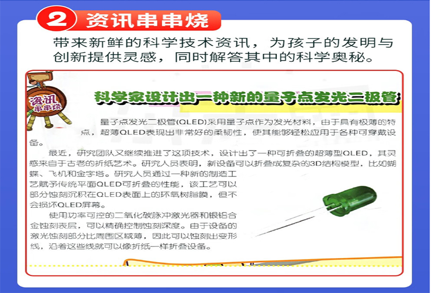 刊物采用全彩印刷,每期48页,半月刊形式全年共24期。内容涵盖科技动态、发明技法、创新成果、科幻故事四大板块,设置“未来爱迪生”“科技小明星”“拍脑袋猛想”“科幻城”“大科学家少年时”“科技创新训练营”等十余个特色栏目。其中,“未来爱迪生”展示学生小发明作品,“拍脑袋猛想”鼓励奇思妙想,“科幻城”精选科幻故事,“大科学家少年时”分享科学家成长趣事,“科技创新训练营”则通过案例解析发明方法,“知识普及+实践指导+灵感激发”的立体化内容体系。