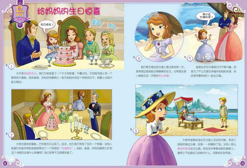 杂志围绕苏菲亚适应皇室生活的过程展开,她原本与母亲在乡村过着简单生活,因母亲嫁给国王而进入皇宫,面临身份转变带来的挑战。作为皇室新成员,苏菲亚需在皇家预备学院学习公主应具备的品质,如诚实面对错误、忠诚对待朋友、同情弱小、优雅处理矛盾等。每一期故事都聚焦具体情境,例如她如何解决与继姐安柏的分歧、帮助朋友克服困难,或通过魔法冒险理解责任与勇气。这些情节让小读者直观感受到:真正的公主气质源于内在修养,而非华丽服饰或头衔。