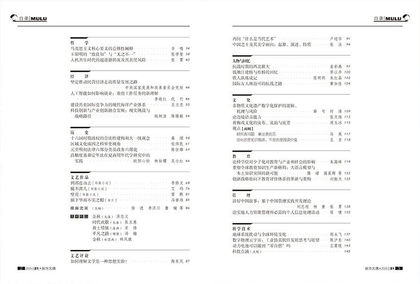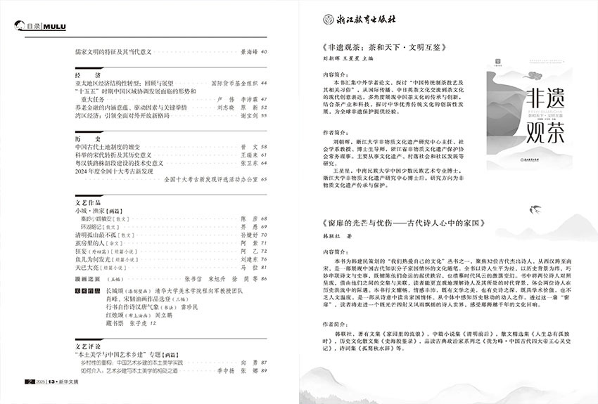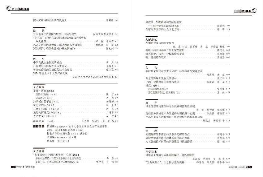 丰富内容矩阵,既有学术深度,又有人文温度。“社会” 栏目聚焦民生热点与社会治理,曾选编关于基层治理创新、社会保障体系建设等专题文章,兼具现实观照与理论深度;“哲学”“经济” 栏目紧跟学术前沿,从跨学科视角破解国际传播精准化难题,成为封面亮点之作。“历史” 栏目兼具学术性与可读性,精选考古发现、历史考证与史论研究,还原历史真相;“文学艺术” 栏目则收录兼具思想性与艺术性的散文、小说节选与文艺评论,让读者在碎片化时代感受完整的文学魅力。