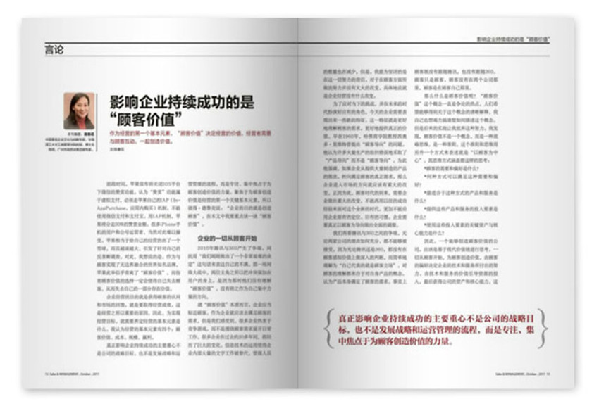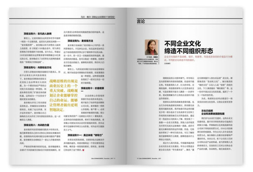 杂志内容覆盖市场营销、销售渠道、品牌建设、战略规划、组织发展、领导力等核心板块。设有“封面专题”、“案例工场”、“策略前沿”、“管理新见”等特色栏目,通过深度专访、实战案例分析、行业趋势解读等形式,剖析商业成功逻辑。其内容以专业性、实用性和前瞻性著称,尤其擅长将复杂理论转化为可操作的企业行动指南。