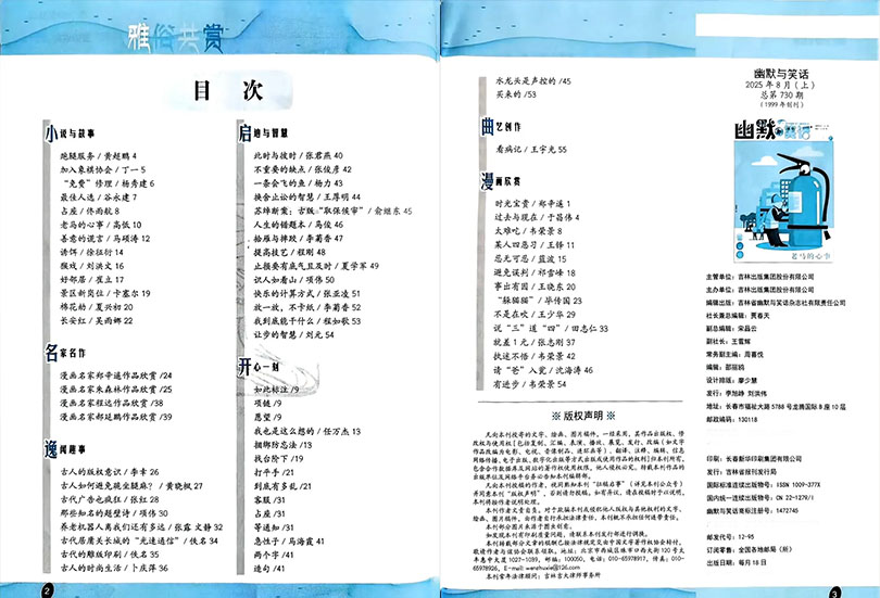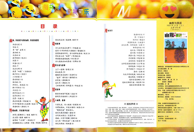 外国幽默:通过翻译和介绍,将世界各地的幽默文化呈现给读者。从法国的讽刺小品到美国的单口喜剧,从日本的冷笑话到印度的幽默寓言,让读者在一本杂志中就能领略到全球的幽默风采,拓宽视野,增进跨文化交流。笑话精华选译:精选国外经典幽默作品进行翻译,确保原汁原味的同时,也注重语言的流畅与易读性。这些作品往往蕴含着深刻的哲理或社会批判,让读者在笑声中反思,在娱乐中成长。