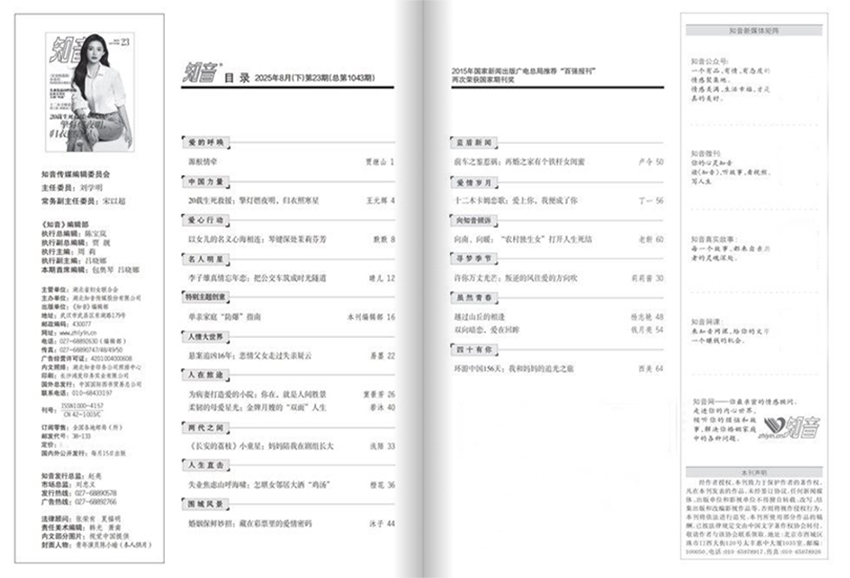 《知音》杂志是湖北知音传媒集团旗下核心刊物,以“人情美、人性美”为办刊宗旨,凭借纪实叙事手法聚焦普通人的情感与生活,被誉为“中国家庭情感类纪实杂志第一刊”。创刊号即发行40万份,首年月发行量突破137万份,创造中国期刊史奇迹;1999年改为半月刊后月发行量跃升至450万份,巅峰时期发行量超630万份,曾荣获“新中国60年有影响力的期刊”等国家级荣誉,2025年更入选“中国邮政发行百强榜”,与《求是》《半月谈》等共同跻身国内重要期刊行列。