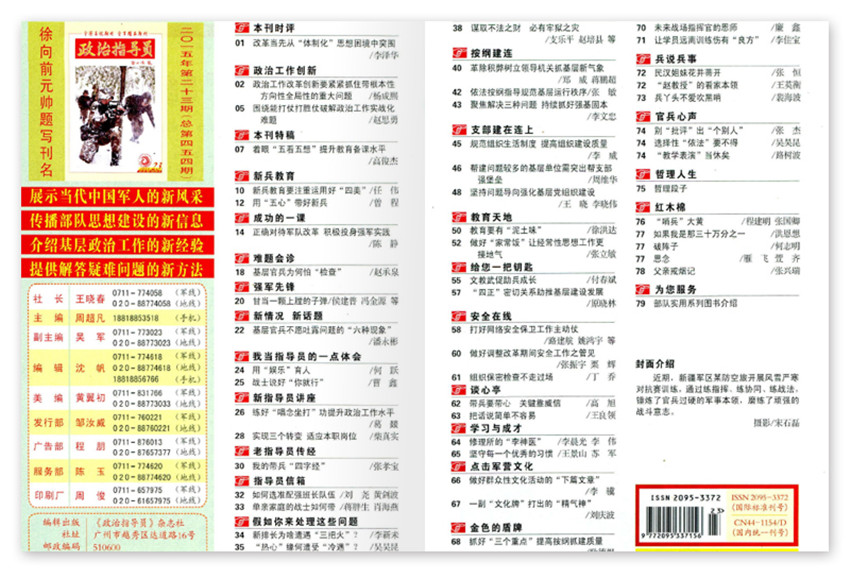 《政治指导员》杂志以“服务基层、服务官兵、服务战斗力”为宗旨,聚焦基层部队思想政治建设,紧扣时代脉搏,回应官兵关切。内容涵盖“学习践行强军目标”“支部建在连上”“政治教育”“军兵种动态”等核心栏目,既深入解读党的创新理论,又生动呈现基层实践案例。通过“难题会诊”“专家支招”“心理加油站”等特色专栏,杂志为政工干部提供理论指导与方法支撑,同时关注官兵心理需求,传递人文关怀,被誉为“指导员的‘指导员’”“基层官兵的良师益友”。